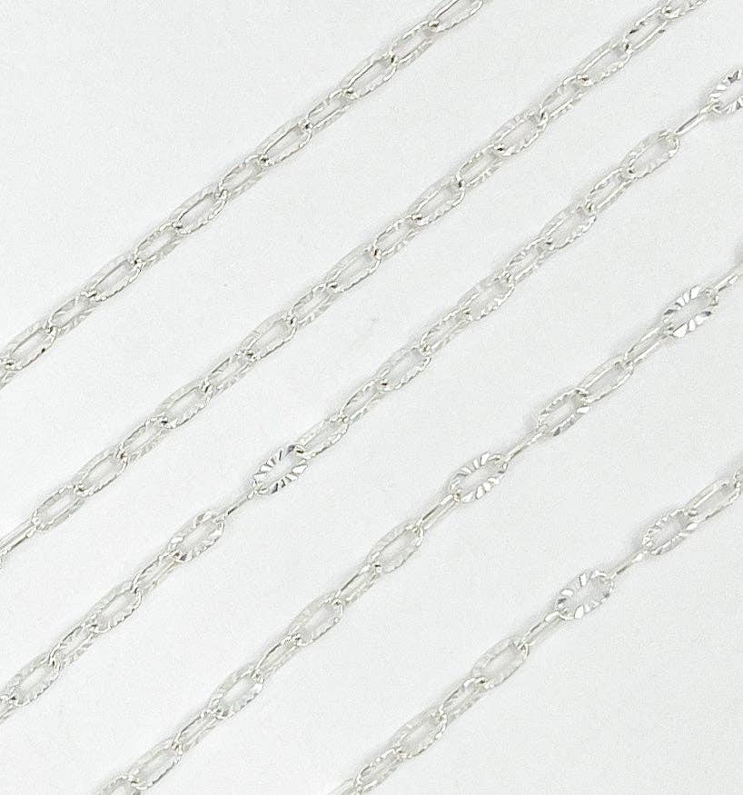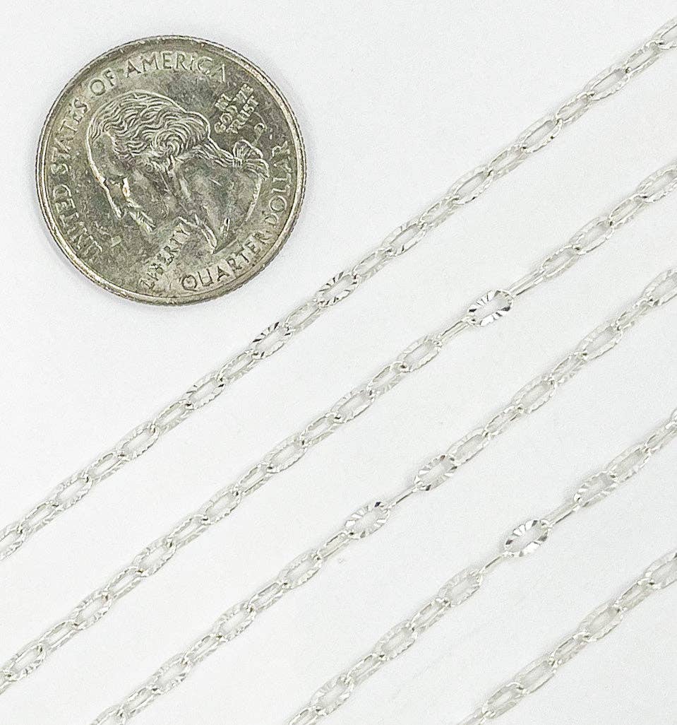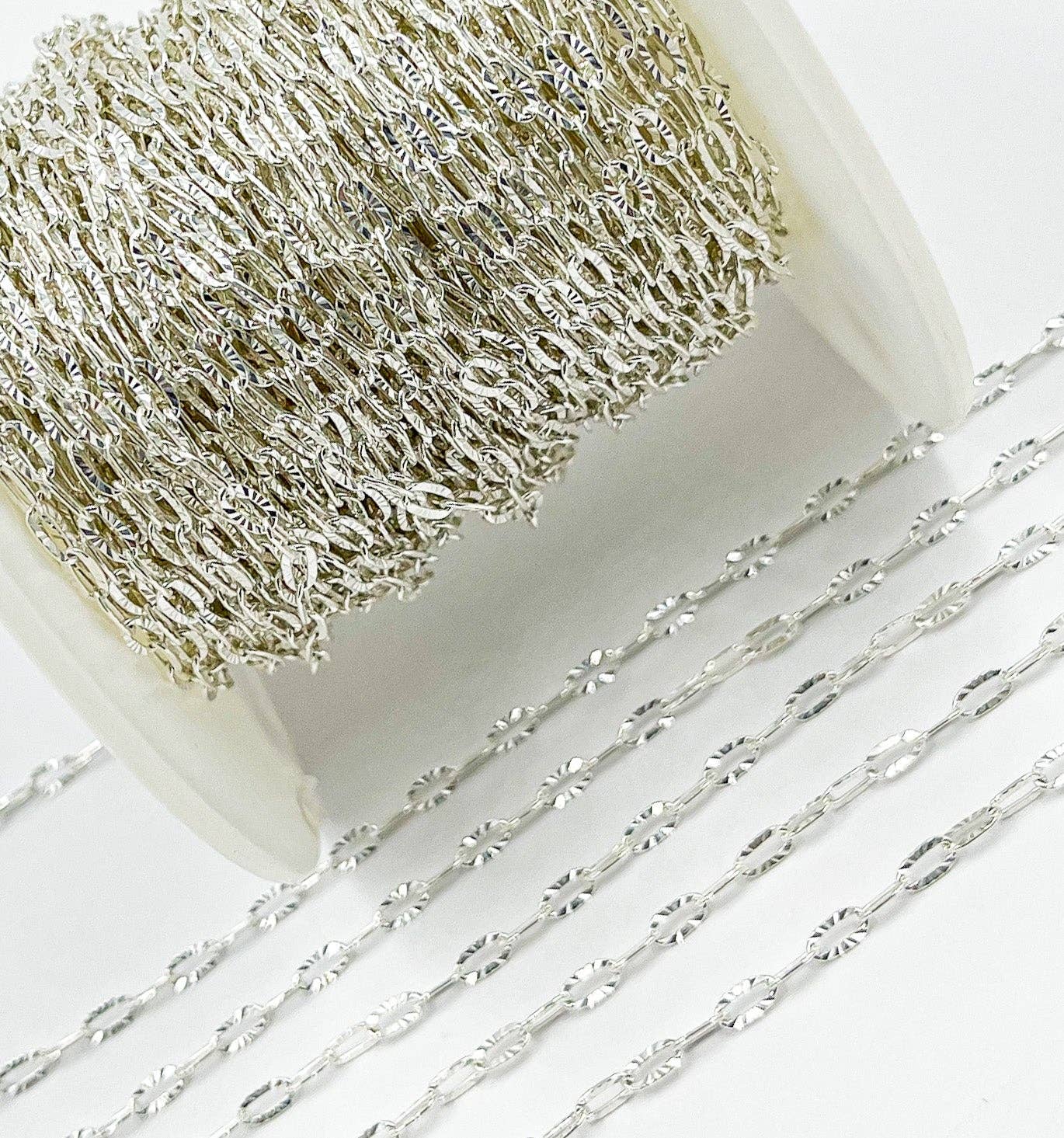 925 Sterling Silver Diamond Cut Cable Link Chain Link Size: 5x3mm. Sold by foot.
